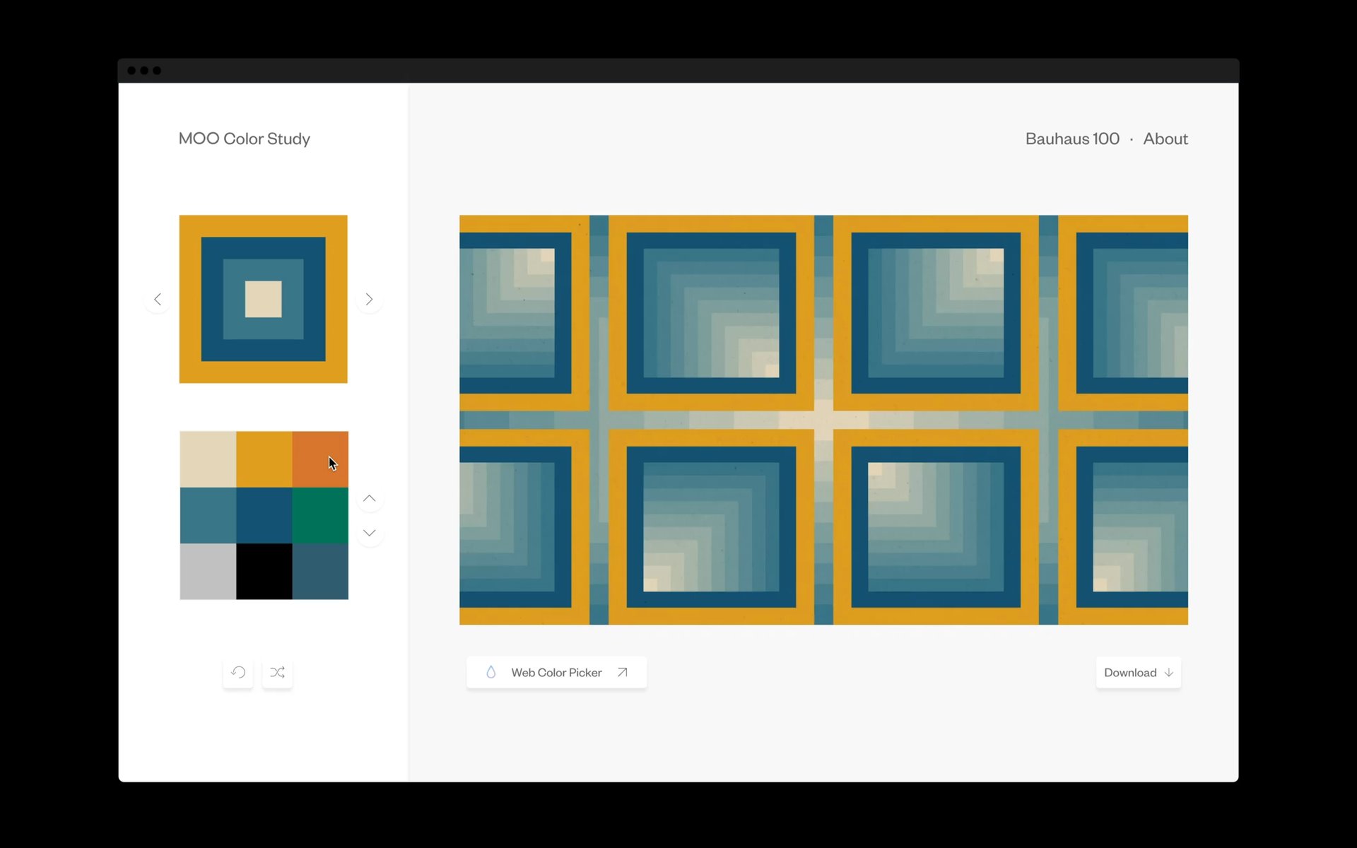 Moo Colors + Bauhaus 100th AnniversaryDesign, EngineeringTo celebrate 100 years of the Bauhaus we made a web application for exploring color relationships through composition.What we made for Moo:A collection of Bauhaus inspired patternsAn interactive color tool showcasing Josef Albers' theories on colorA color-picker browser extensionAn animated history of Josef Albers' work at the BauhausTest